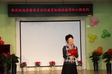 Du Jun, the executive principal from the headquarters of the Kindergarten, welcomes teachers and students from Friendship Kindergarten of Hong Kong Victoria Educational Organization as