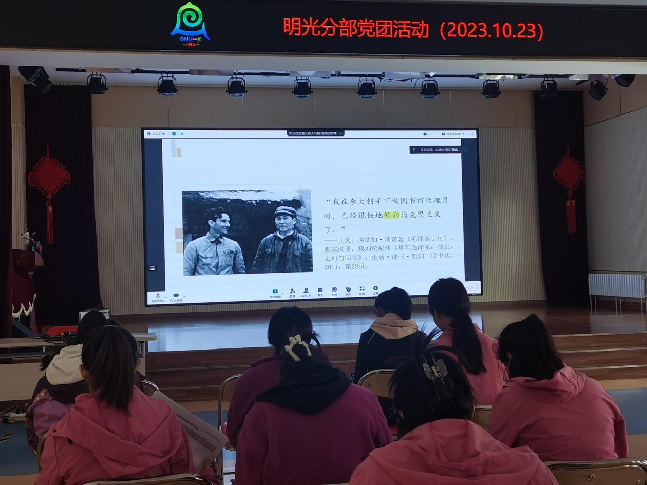 2023年10月23日,按照正规滚球app官方网站党总支的统一部署,第一党支部邀请“北京师范大学青春讲师团”的曹晴同学做题为《1920年前后的青年毛泽东——记一次艰难的思想转变》的主题宣讲。曹晴同学为滚球app马克思主义学院思想政治教育专业2022级硕士生,曾获滚球app马克思主义学院2022-2023年优秀宣讲员的荣誉称号。