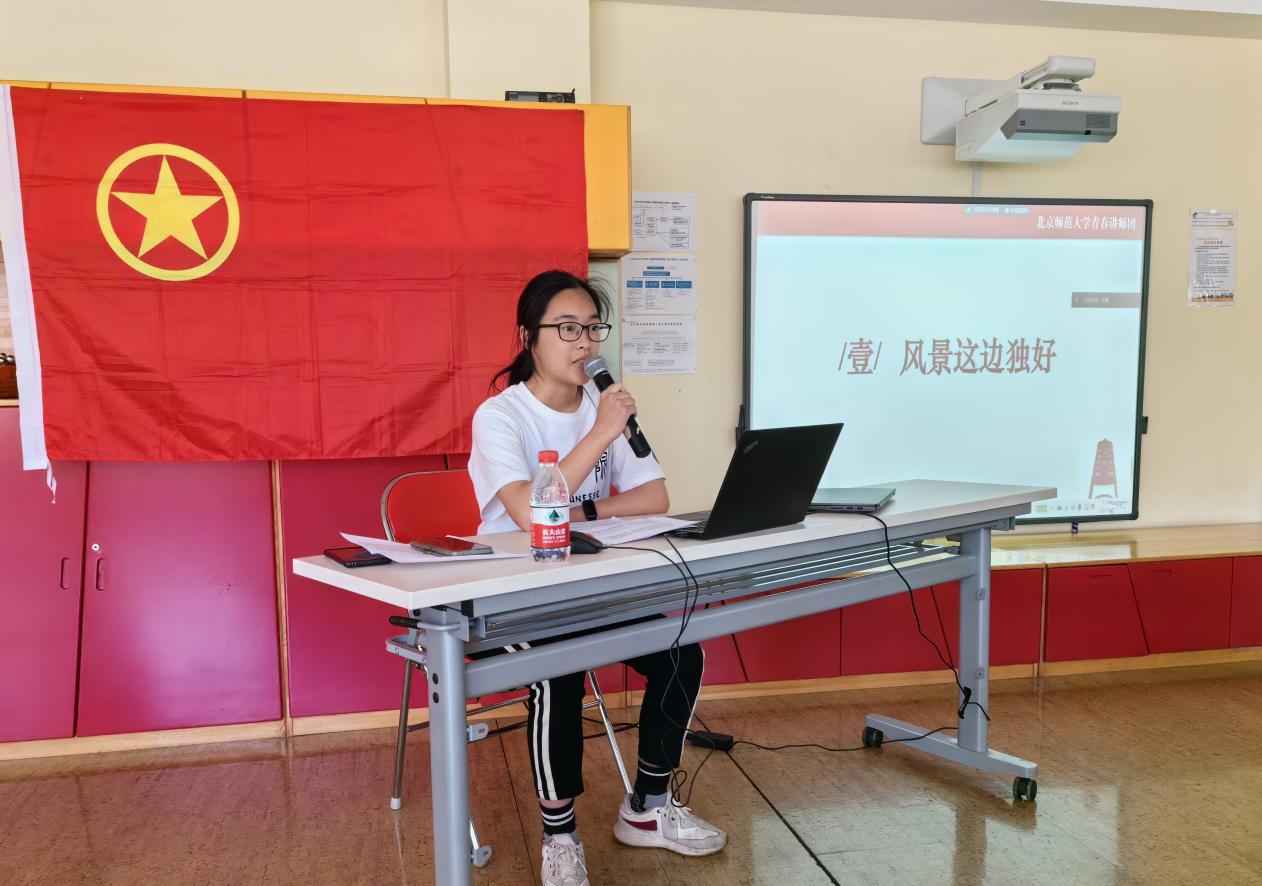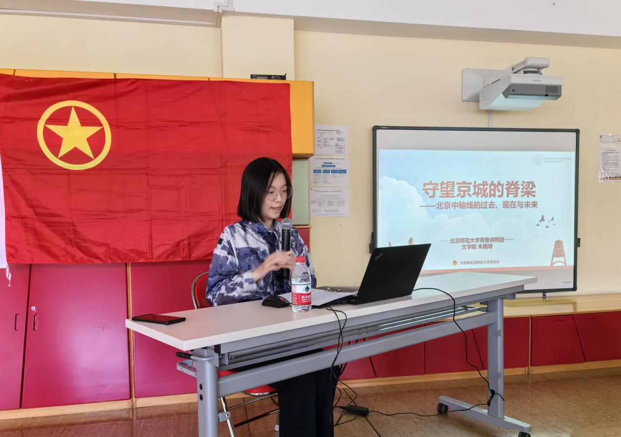 首先,文学院朱雨琦同学带来《守望京城的脊梁——北京中轴线的过去、现在和未来》的宣讲。宣讲依托党的二十大报告对于文化遗产的相关论述,结合宣讲人的亲身实践,就北京中轴线的“过去”“现在”与“未来”进行介绍。宣讲内容与现场课题组的教师产生了极大的共鸣,也让老师们更加深入的了解北京中轴线的文化内涵,更加激发起教师基于身边优秀的传统文化资源转化为发展课程的意愿,也激励了教师带领幼儿了解、体验和传承中华优秀传统文化的责任感和使命感。