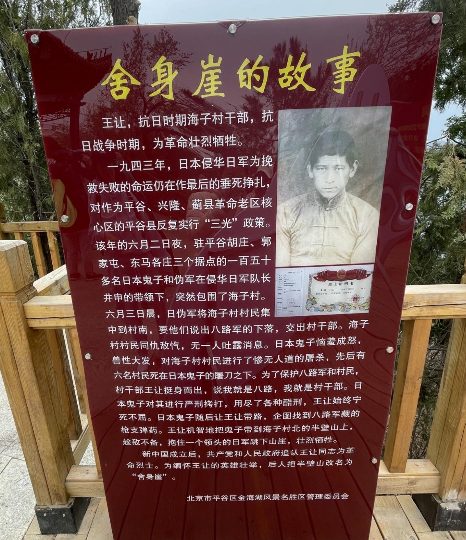1943年的一天,金海湖南方下游海子村,突然被日军包围,日军把全村百姓聚集到一起逼问八路军的下落,在这危险时刻,海子村干部王让挺身而出,将日军带到了舍身崖,趁敌不备,抱住一个领头的日军跳下山崖,壮烈牺牲。