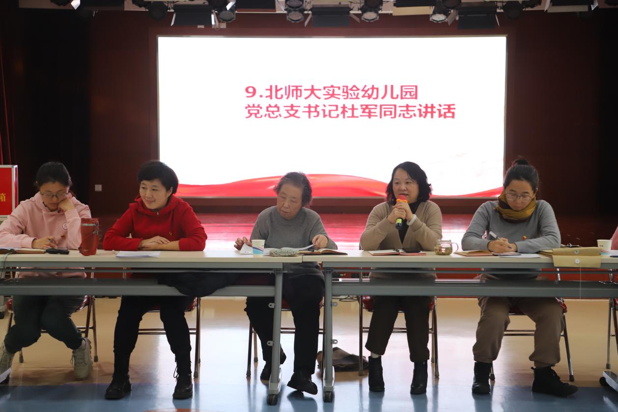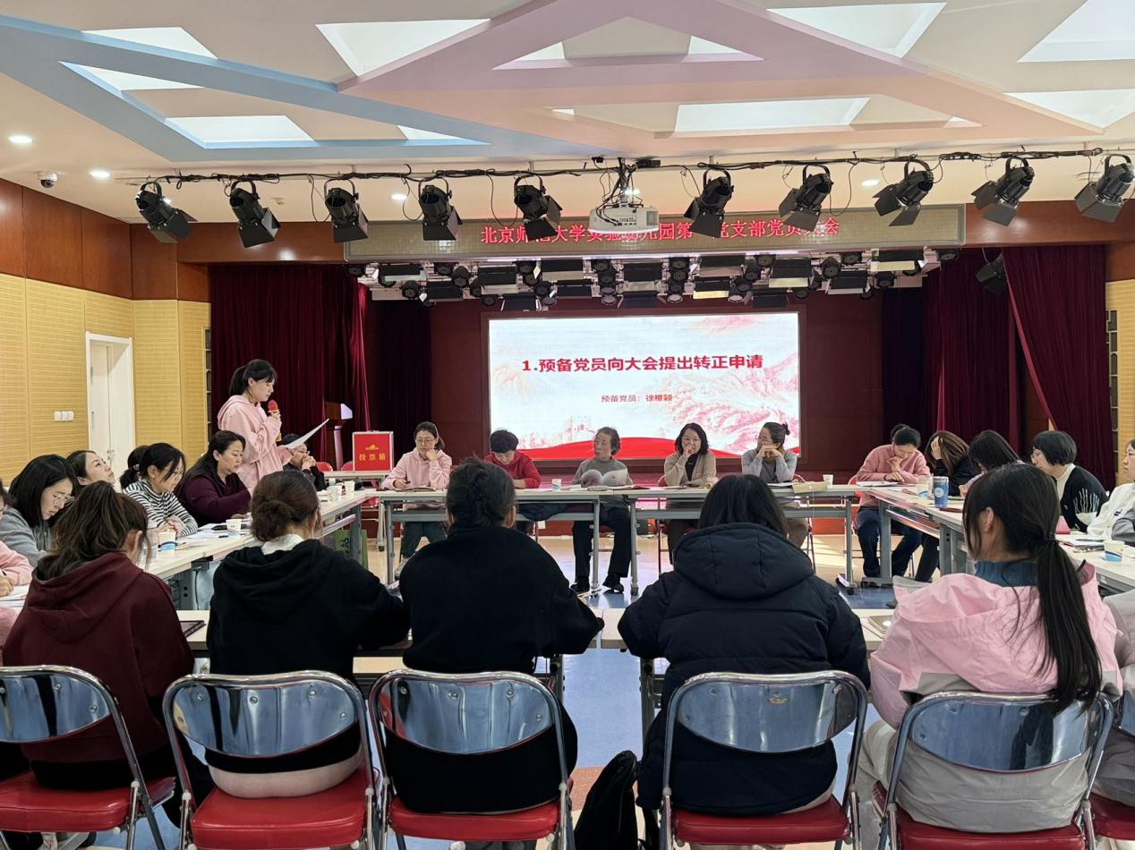 2024年11月22日,正规滚球app官方网站第一党支部在校本部园多功能厅召开全体党员大会,主要讨论发展罗楠同志加入党组织和徐稚颖同志预备党员转正两项事宜。本次大会由北京市师范大学实验幼儿园第一党支部书记滕瑾主持,本次大会应到会党员39人,实到会党员33 人,北京师范大学组织委员金秀荣老师受邀出席会议,第一党支部流动党员、积极分子、入党申请人共计 4 人列席会议。