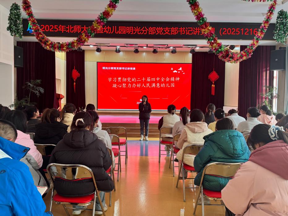 为深入学习贯彻党的二十届四中全会精神,统一思想共识,凝聚发展合力。2025年12月16日,北京师范大学实验幼儿园明光党支部书记邱守开展了以《学习贯彻党的二十届四中全会精神,凝心聚力办人民满意幼儿园》为主题的党课,全体党员、入党积极分子、递交入党申请书教师及团员教师共同参加学习。