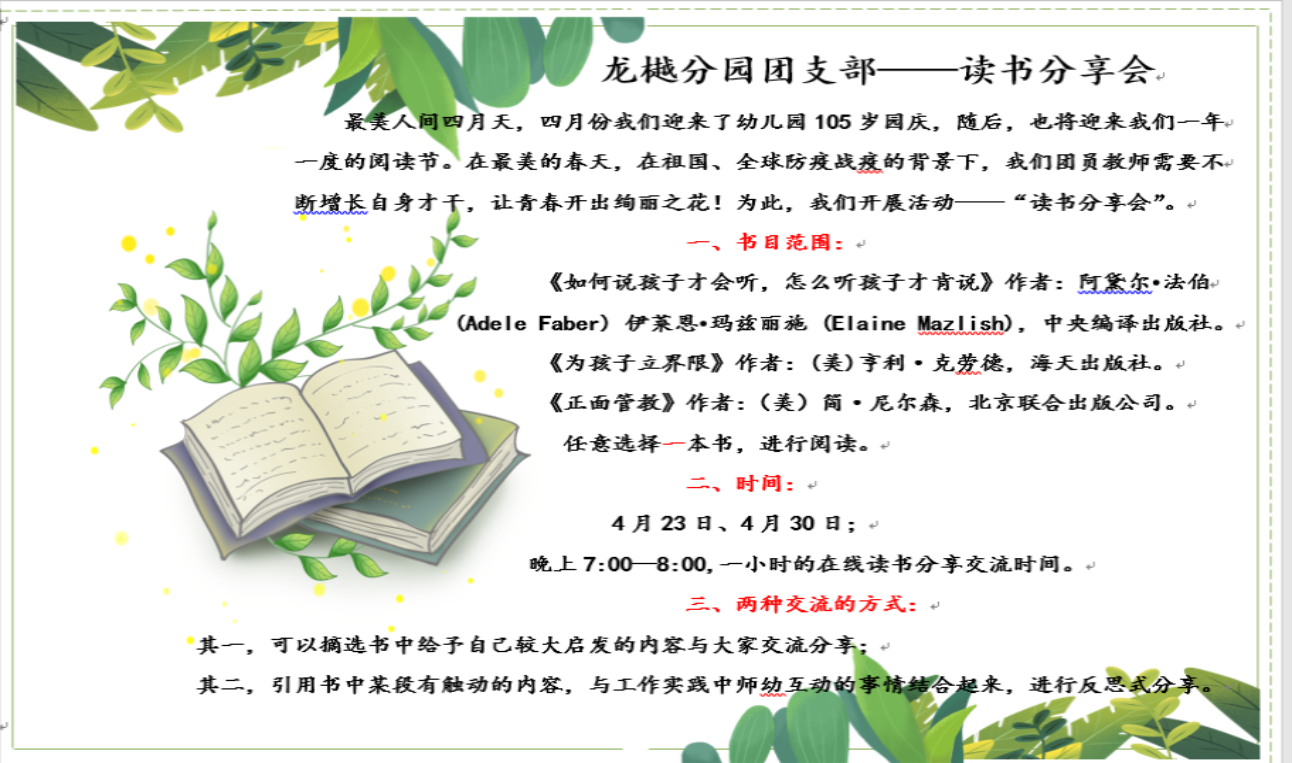 在正规滚球app官方网站105岁生日及读书日来临之际,龙樾分园团支部圆满举办了读书交流分享会活动。本次活动推荐了《正面管教》、《为孩子立界限》、《如何说孩子才会听,怎么听孩子才肯说》三本读物,活动对象为龙樾分园团支部全体老师,主要形式是自选读物阅读以及分享心得。通过这次活动,老师们丰富了知识、拓宽了视野,并借助与工作经历的结合获得了经验积累,同时还明确了作为一名幼儿园教师的“初心”——尊重儿童,研究儿童,促进儿童主动发展。