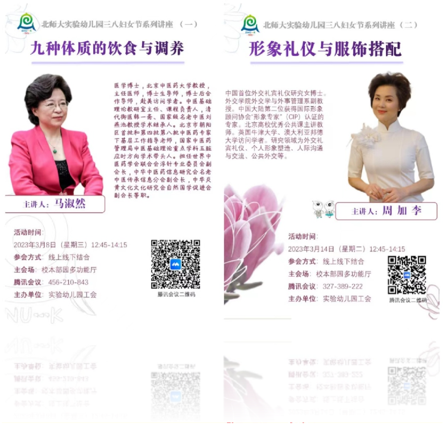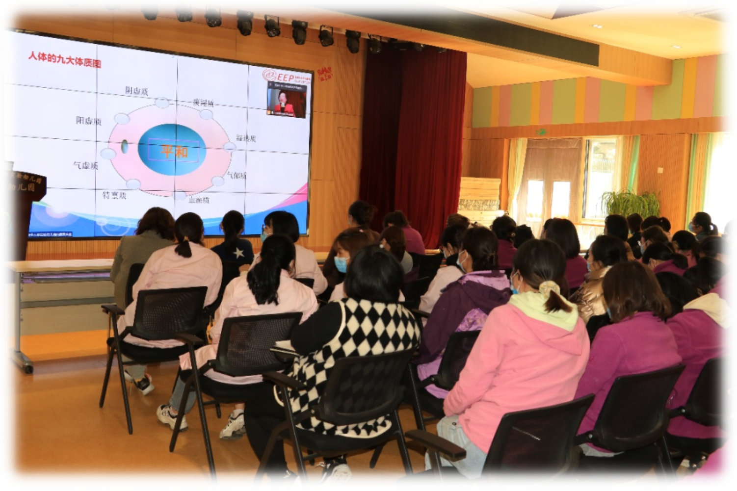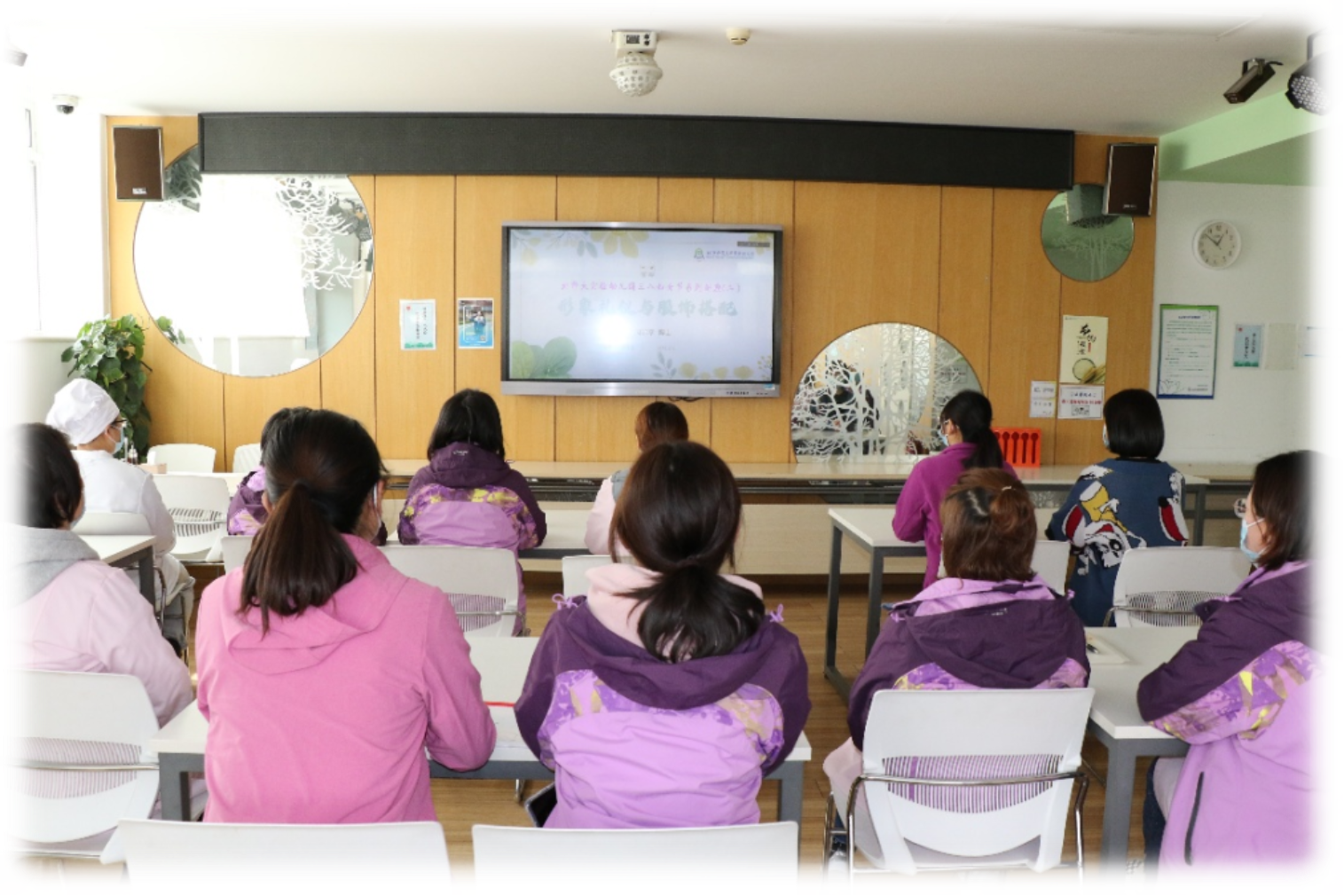 在总部工会的策划下,新校区园组织各岗女教职工在分会场进行《九种体质的饮食与调节》、《形象礼仪与服饰搭配》两场讲座观看与学习。