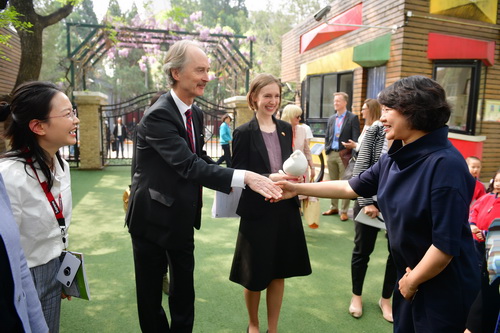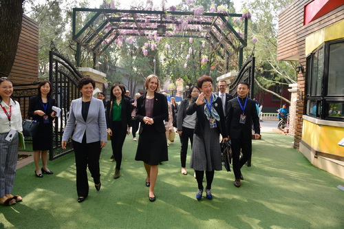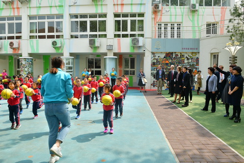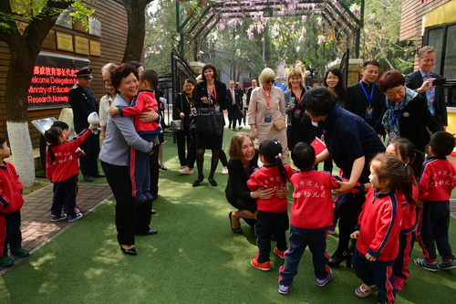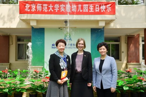 应国家科技部以及北京师范大学的相关部署,2018年4月18日,我园接待了来自挪威教育部长团一行14人的来访。代表团由挪威教育科技部部长Ms. Iselin Nyb?率队,北京师范大学副校长郝芳华、国际交流与合作处副处长陈娟、肖铠陪同。我园总园长黄珊和校本部园执行园长杜军接待了来访。