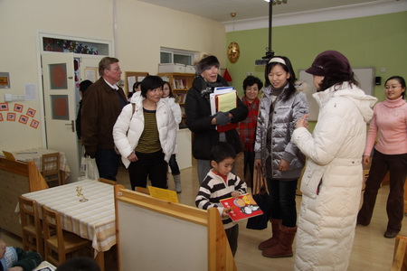 2010年1月7日下午,美国新墨西哥州立大学早期教育学院院长Candace Kaye教授和美国新墨西哥州早期教育官员Michelle Saenz一行三人在我校教育学部学前教育研究所霍力岩教授和教育学部武海涛老师的陪同下来我园访问,黄珊园长热情接待了来宾。在友好的气氛中,黄园长向外宾简要介绍了我园情况,之后双方在共同感兴趣的教师职后培训方面进行了深入的交流,还共同展望了未来开展学前教育跨文化研究与合作的项目。座谈结束后,Candace教授一行在黄园长的陪同下参观了幼儿园的班级、图书馆和新年环境。我园具有浓郁中国传统文化特色的新年环境布置给外宾留下了深刻的印象。