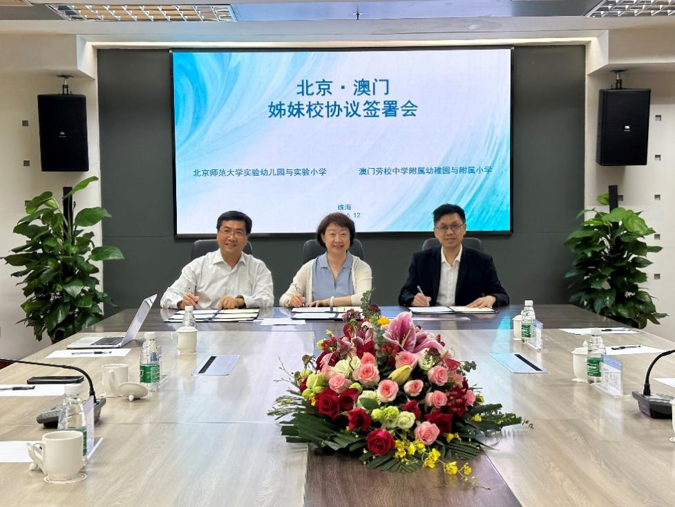 2023年6月12日,正规滚球app官方网站、实验小学与澳门劳校中学附属幼稚园、附属小学姊妹校签署会,在北京师范大学珠海校区国际交流中心隆重举行。我园总园长黄珊、实验小学校长吴建民、澳门劳校中学校长郑杰钊代表双方学校正式签署了姊妹校协议。参加签署会的还有:澳门劳校中学副校长林伦伟、澳门劳校中学附属幼稚园主任黄绮珊、澳门劳校中学附属小學副教导主任陈禹,以及北京澳门双方学校的老师们。北京师范大学教育学部教师教育研究所副所长袁丽副教授主持签署会。