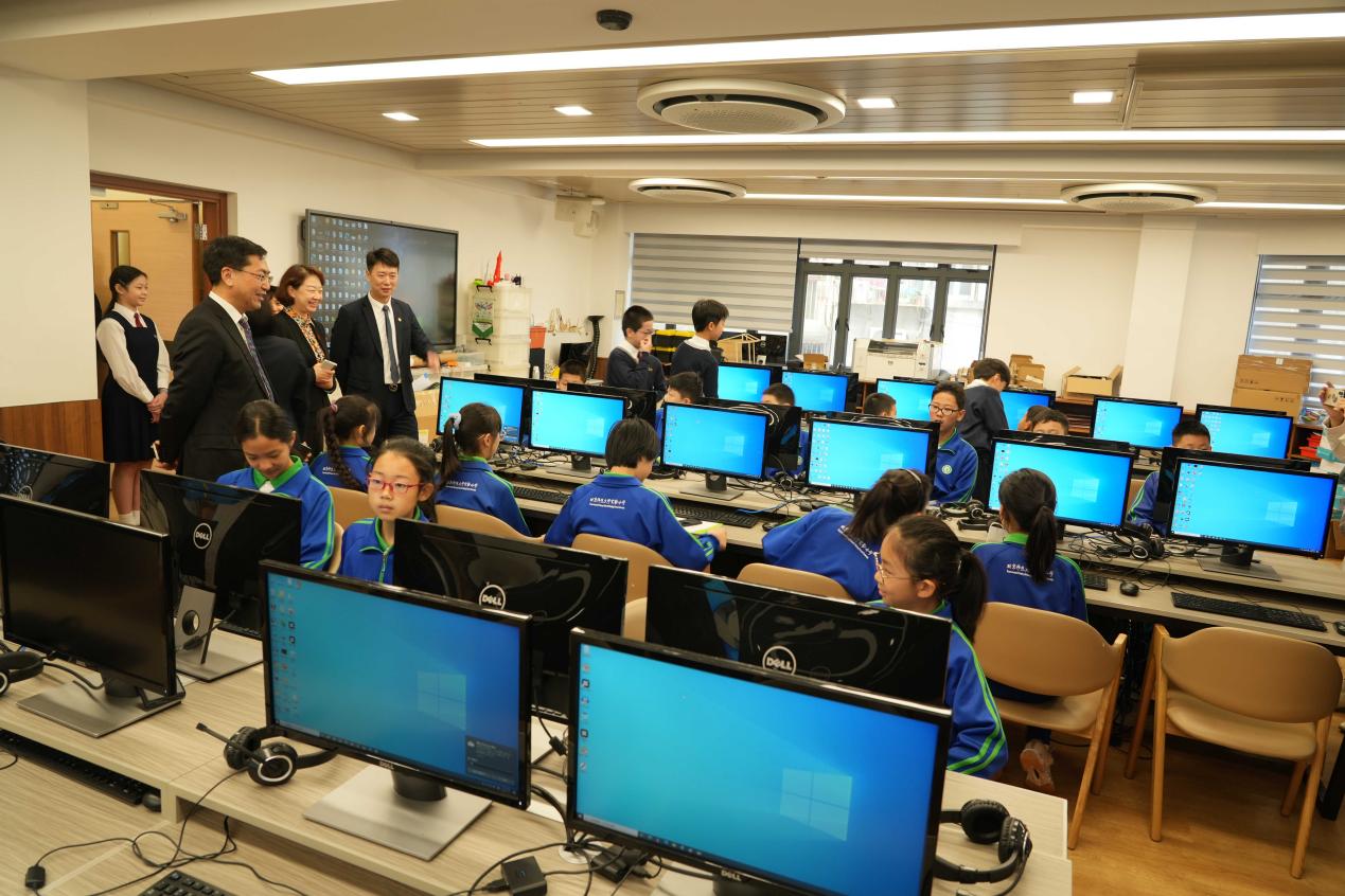 上午,在劳校中学附属小学,访问团一行首先来到操场,聆听了小学生介绍的“光辉百年.美好家园”壁画,参观了图书馆、电脑室、科普室等功能教室,详细了解了塑胶瓶盖回收壁画《“塑”造澳门新八景》的创设过程。劳校中学附属小学在爱国教育、信息化建设、STEM课程等方面的探索给访问团留下了深刻的印象。