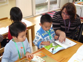 来到图书馆认真地翻阅,并饶有兴趣地与孩子们共同阅读