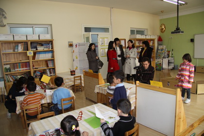 来宾参观幼儿园的图书馆