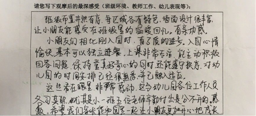 通过家长开放日活动,架起了一座家园沟通携手共育的彩虹桥,不仅拉近了家庭与幼儿园之间的距离,搭建了家长与教师之间沟通的平台,同时也向家长宣传了幼儿园的教育理念和课程内容,让家长更了解幼儿在园的各方面情况,从而更好的形成家园合力,促进幼儿健康全面的发展。