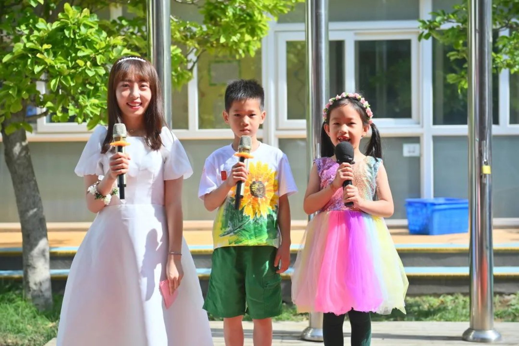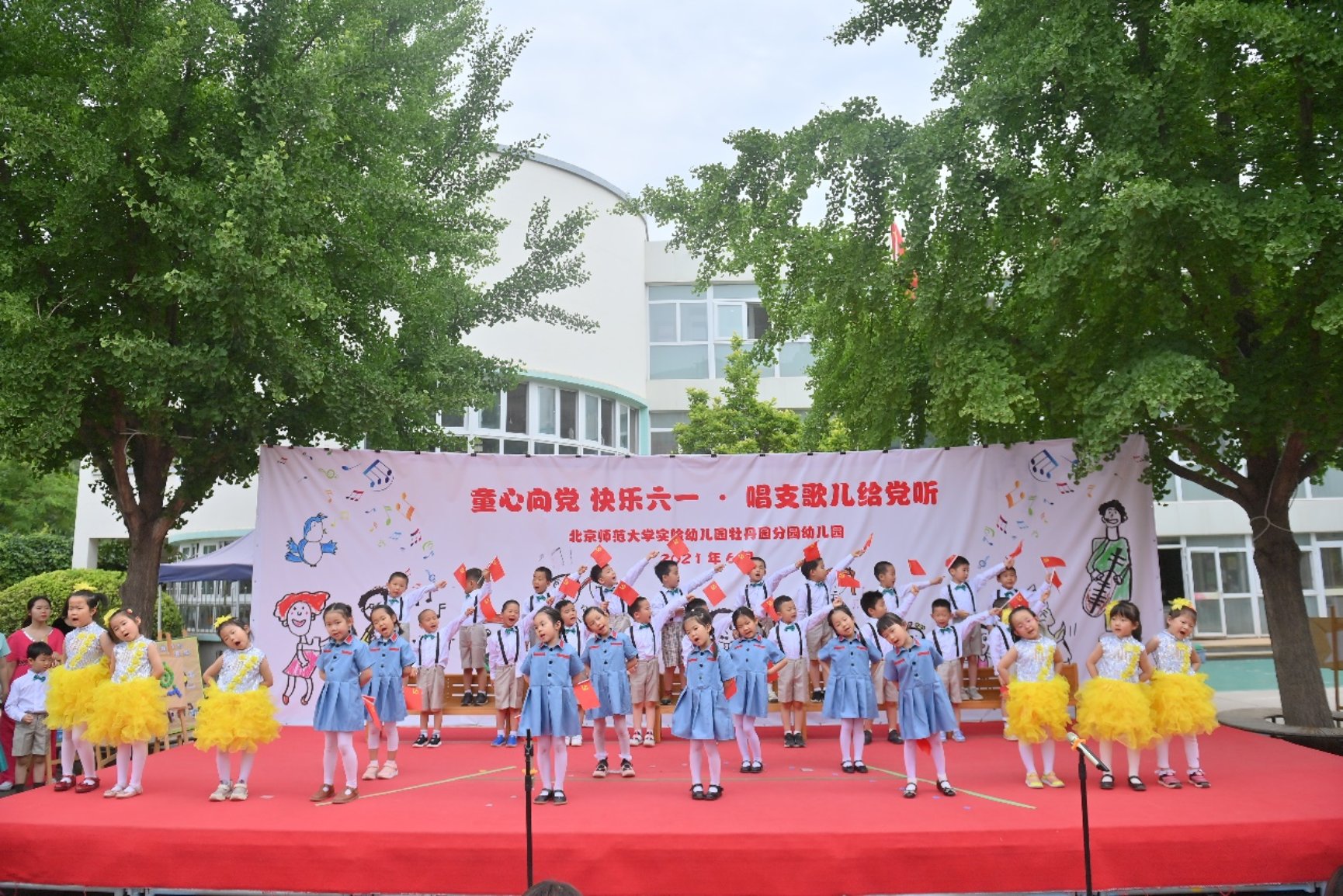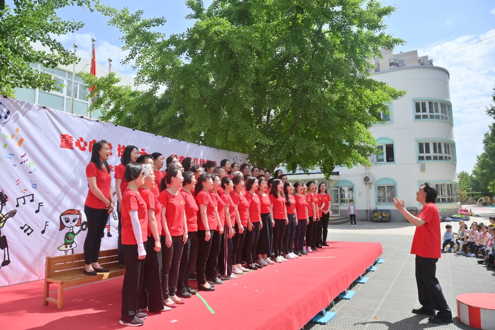 入场后,大家在院子里齐唱《我是一朵小花》、《庆祝六一》共同庆祝自己的节日。