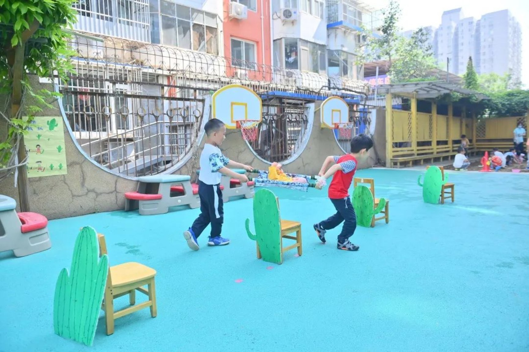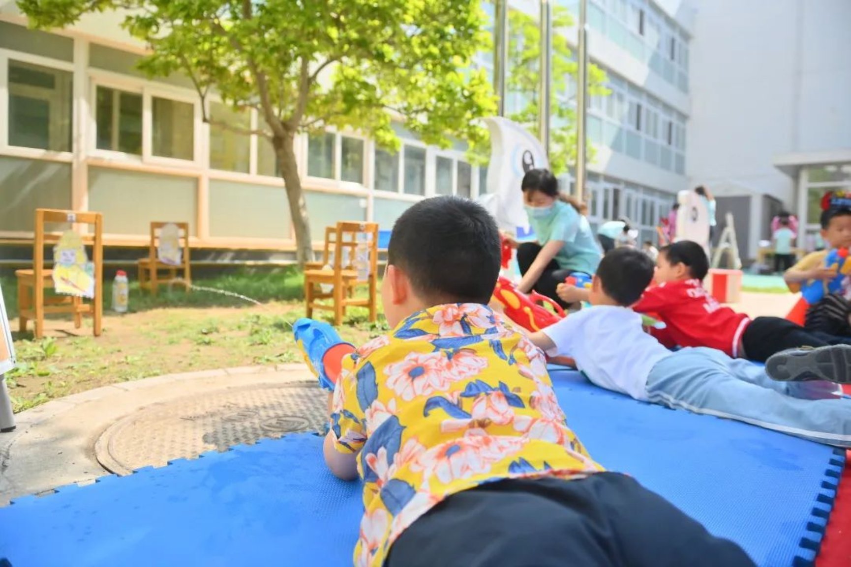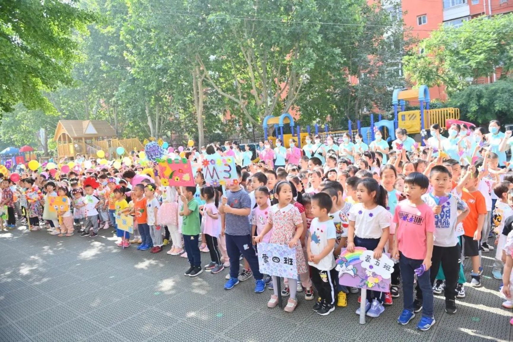 入场后,大家在院子里齐唱《我是一朵小花》、《庆祝六一》共同庆祝自己的节日。