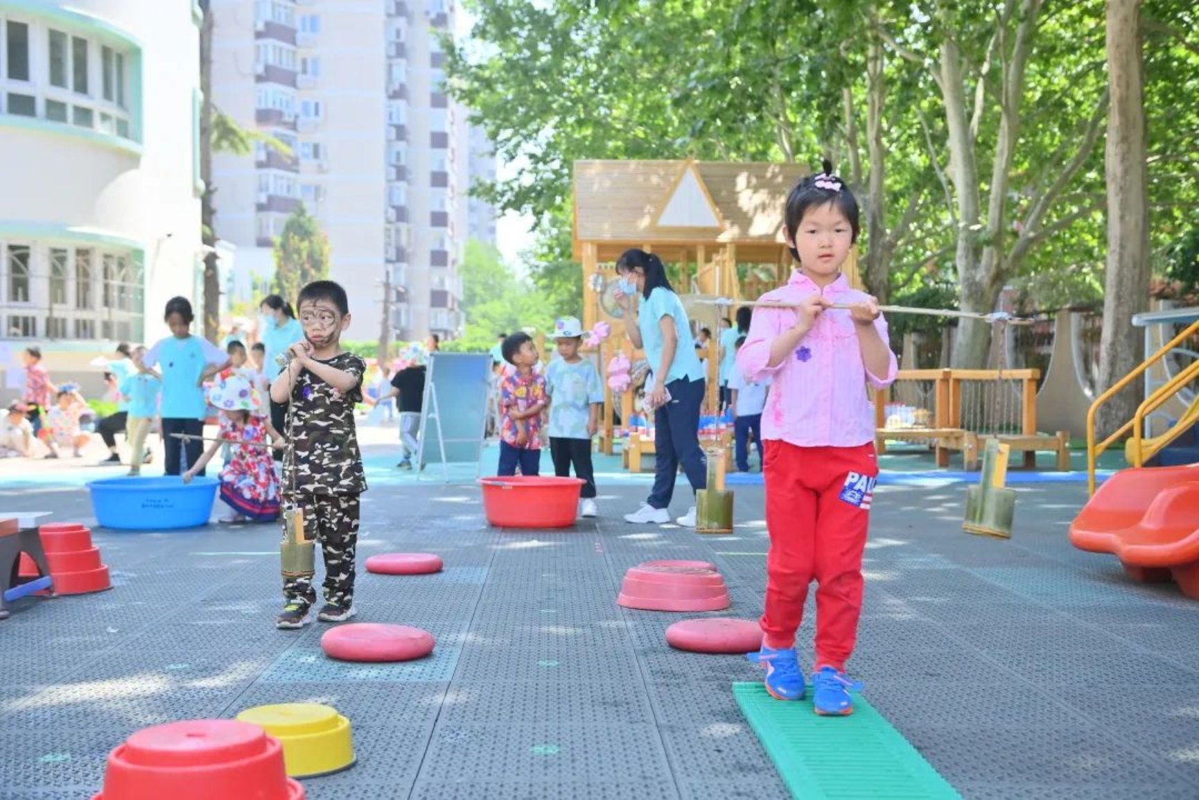 本次六一游艺会,共设29个项目,有快乐运动场、欢乐水世界、花仙子创意区和穿越沙漠四个区域。老师们给每个项目都设计了好玩有趣的情境和活动名称,孩子们通过游戏不仅可以锻炼动作的协调性和灵敏性,有的游戏还能锻炼幼儿方向感、手臂肌肉发展、手眼协调能力、核心力量和平衡能力等。特别是本次游艺增加了夏日特别项目——欢乐水世界,受到了全园幼儿的一致喜爱。每位小朋友都沉浸在运动游戏的快乐中,整个幼儿园都变成欢乐的海洋。