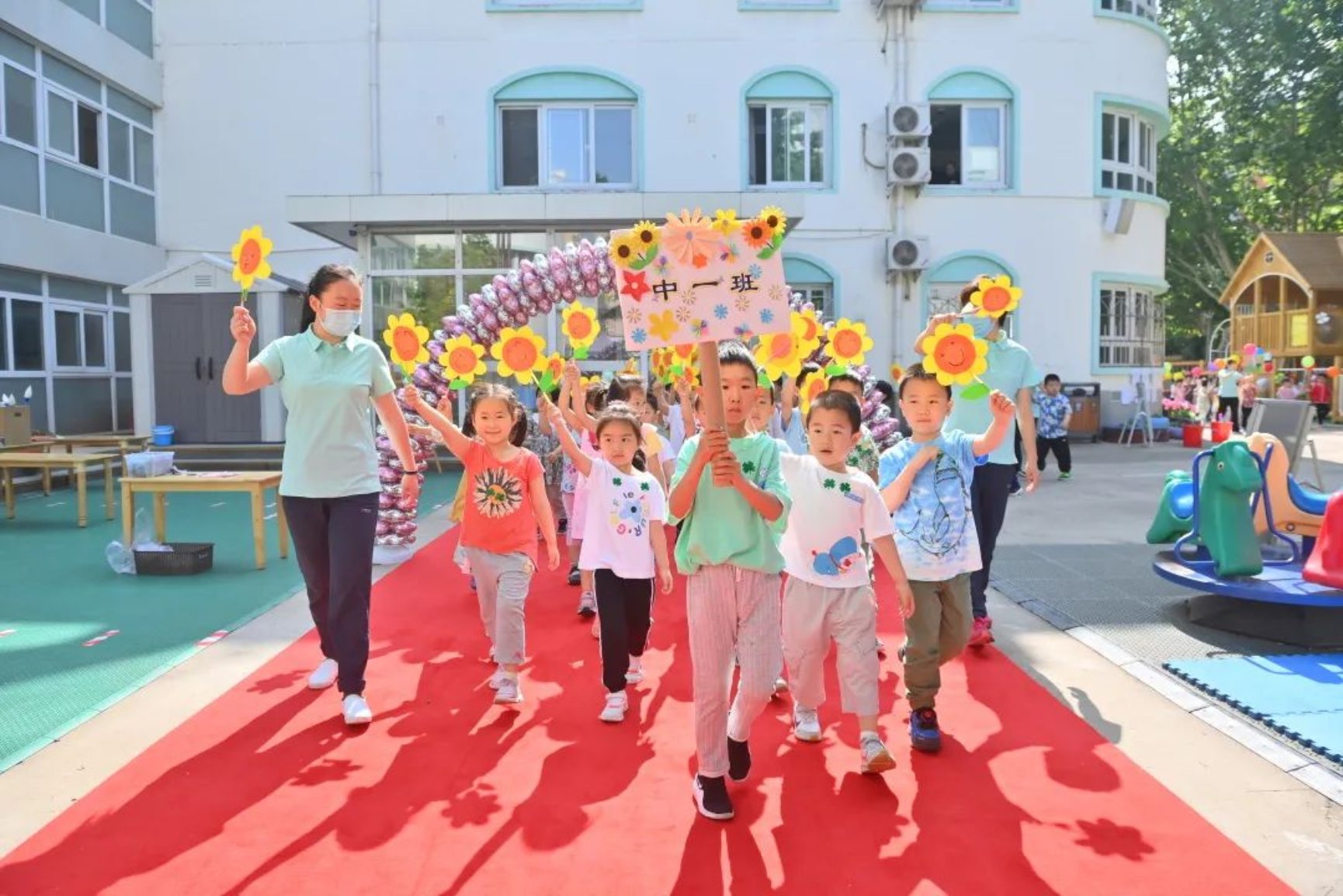 六一当天,一大早幼儿园的每个人都洋溢着幸福的笑脸,今年我园庆祝活动特别的主题为——“滚球app是幸福的小花朵”。全园400多位小朋友都穿上了花元素的衣服,每一位都像含苞待放的小花,沐浴在初夏绚烂的阳光之下。活动开始,每个班的小花们,迎着微风,迎着朝阳。大家穿着各式各样的花衣裳,个个欢欣雀跃、朝气蓬勃的走上红毯,迫不及待的加入六一盛会。
