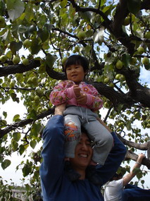 骑在爸爸的脖子上,再高的苹果也能摘到!
