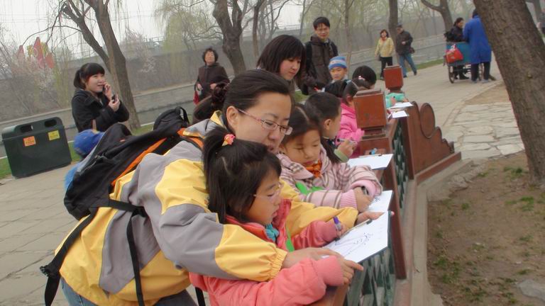 中大班选择了春景盎然的颐和园,并为大班孩子设置了数狮子、画十七孔桥、讲述长廊故事、采访游人等项目,在春季美景中培养了幼儿的任务意识;