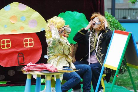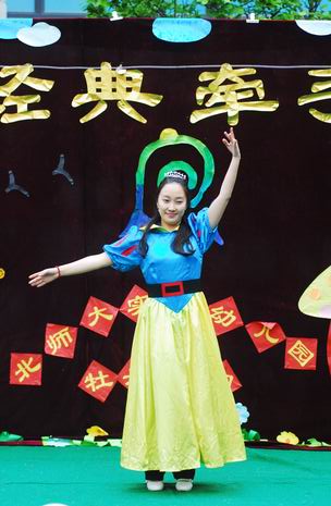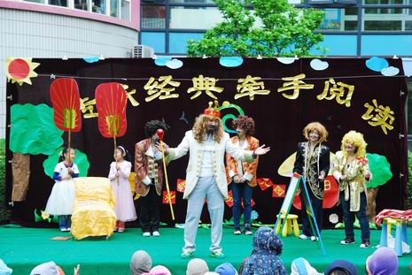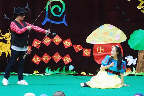 在开幕式上,教师和孩子们一起精心编排了多个经典童话剧和经典故事,如《白雪公主》、《皇帝的新装》、《小兔乖乖》等。在故事表演的过程中,老师们还惟妙惟肖地讲述了《两只笨狗熊》、《老虎拔牙》、《我想养只宠物》、《爱生气的小熊》、《小象要回家》、《穿西装的吹气猪》等经典传统故事。夸张的造型、生动的表演、抑扬顿挫地讲述,让孩子们笑声不断、掌声连连。在开幕式中,孙园长还即兴给孩子们讲述了民间故事《母象与小象》,幽默风趣的语言、扣人心弦的故事情节,深深地吸引了全场的听众们,博得了热烈的掌声。