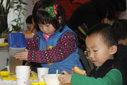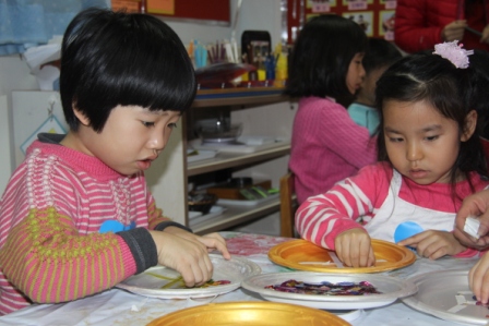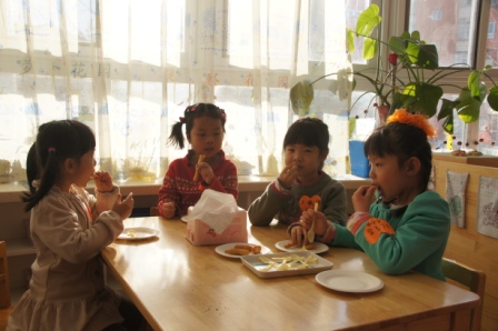 整体活动分为日托楼和全托楼进行:日托楼9个班级,共计12个手工项目和6个食品项目;全托楼7个班级,共计10个手工和4个食品项目;外加一个小小电影院。活动前期老师针对项目、材料和整个活动流程进行了细致的讨论和准备,每个项目制作了精美的海报。庙会前,孩子们通过参观本楼的海报,对活动项目做到心中有数,所以活动当天很多孩子都是带着自己的计划进行游玩的。