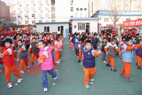 婴班幼儿在牡丹园资深老教师的带领下展示早操