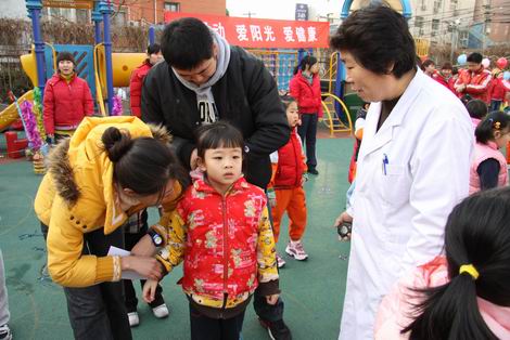 体育专职教师和保健医一同为幼儿测运动中的心率