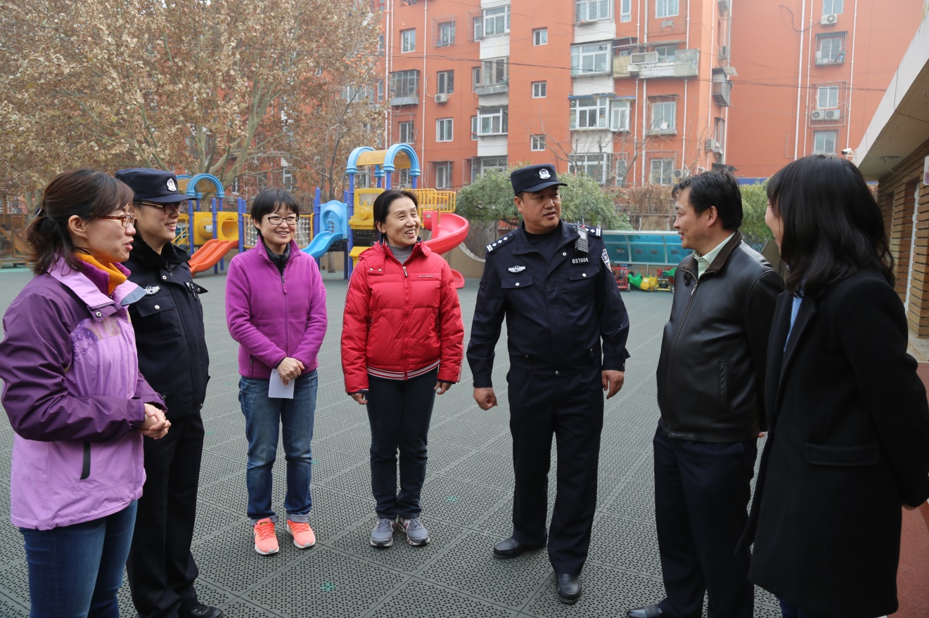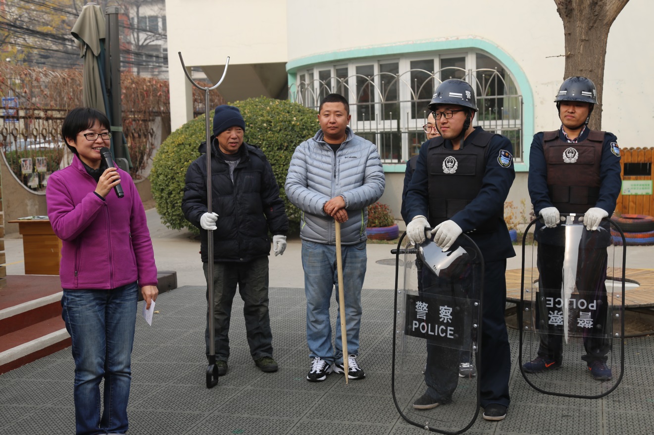 在随后的11月26日下午1:00,花园路街道武装部部长张红权、花园路街道综治办主任张欣、派出所政委李志生、社区东里居委会主任张秋萍来园指导教职员工进行防恐演习活动。该演习模仿户外活动场景,教师听到警铃声迅速做出反应,组织班级幼儿撤离到安全区域。保安人员按照前期培训内容,将“犯罪分子”成功控制。演习结束后,李志生政委和张红权部长分别对教职工演练情况进行总结。他们充分肯定了幼儿园安全预案的科学性,鼓励广大教师遇到突发情况要处变不惊,当机立断。
