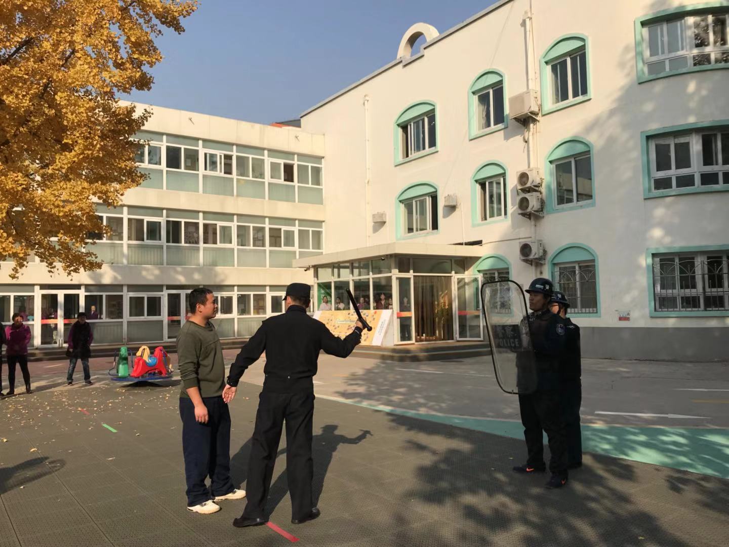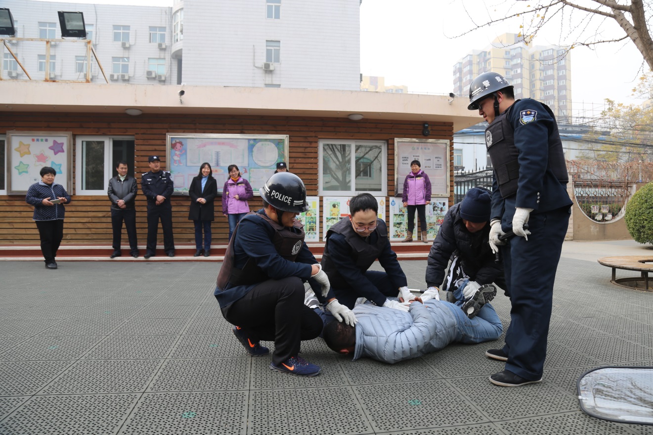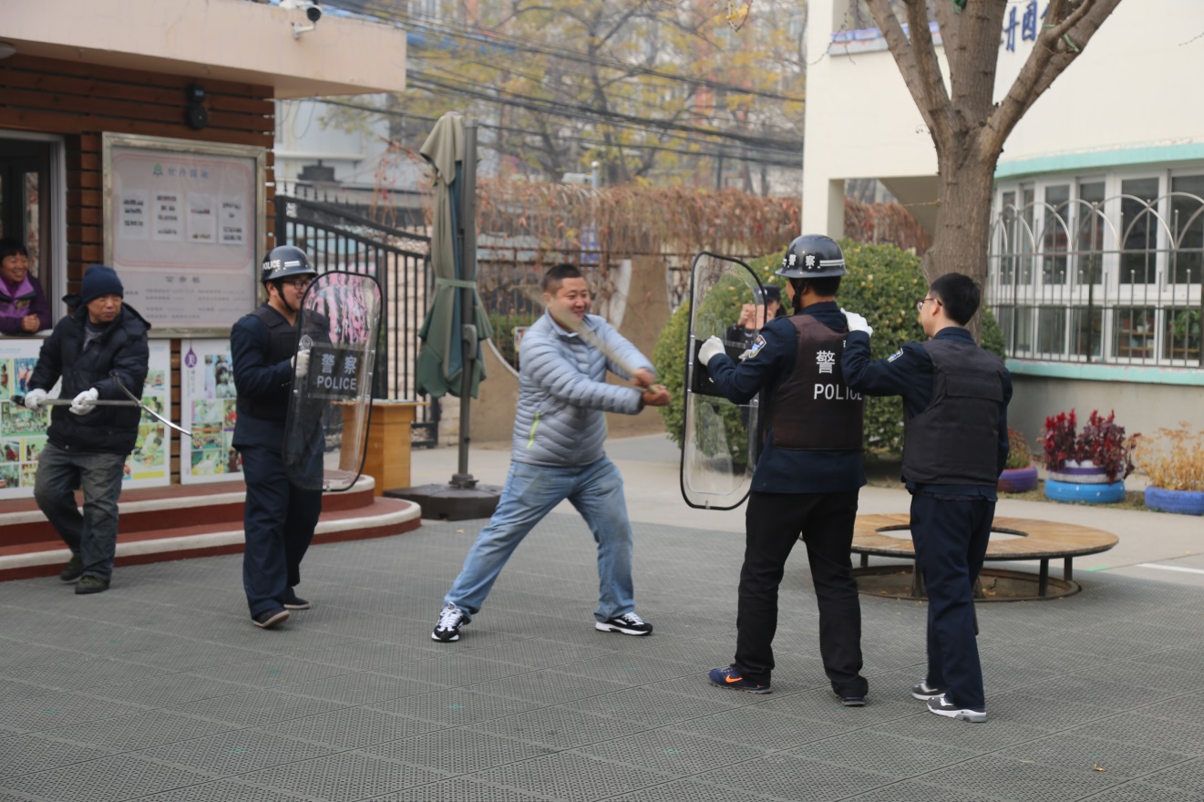 2018年11月8日,花园路派出所民警李菲、段洪浩对牡丹分园教职工和安保人员进行安全培训。两位警官介绍了日常校园安保工作,遇突发暴力事件如何应对,如何保护在园幼儿与教职工安全,如何使用防护用具等方面进行系统的讲解和具体的示范。两位警官深入浅出的讲解和身体力行的示范,使教职工了解了遇到突发事件的解决方案和具体方法,从惶恐不安到能够沉着、冷静面对突发暴力事件。