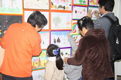 家长和孩子们一起欣赏讨论作品