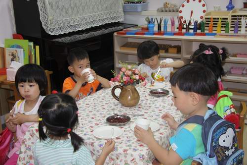 健康:“娃娃餐厅”中孩子们自己冲饮料、制作小点心,休息;户外游艺项目锻炼身体,健康游戏。