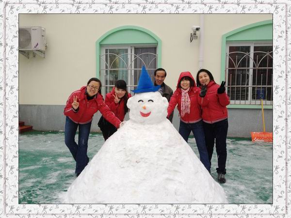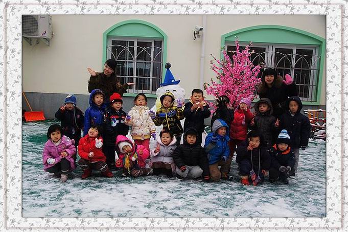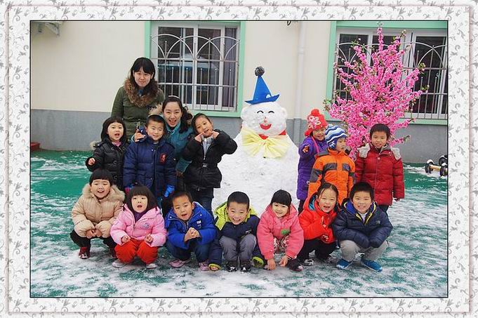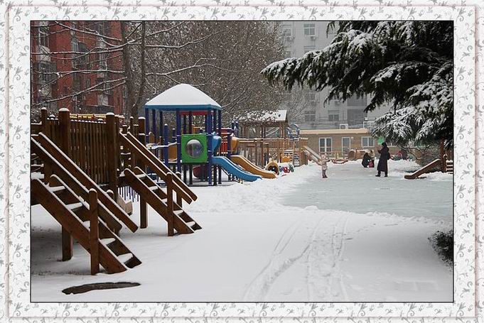早上起来,一片洁白的世界,难得一遇的鹅毛大雪。幼儿园里树枝上、操场上、滑梯上,都是厚厚的积雪。