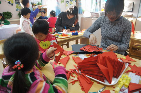 (新年传真之二) 一年一度的庆元旦、迎新年活动正在热烈而隆重地开展着。为了让孩子们既接受传统文化的熏陶,又有快乐的体验,全托班老师们围绕幼儿喜欢生动形象、颜色鲜艳的直观视觉刺激的特点,充分运用自己传统节日中的文化资料,精心策划了“民俗美工日”活动,受到孩子们的热烈欢迎。 12月18日上午,全托班利用各个教室开辟了多个活动区,包括剪窗花、贴福字、写马年吉祥话、做拉花等传统手工艺项目。大孩子、小孩子们手拉手自主选择游艺活动,每个活动项目都让孩子们爱不释手,欢乐的新年气氛溢满整个幼儿园。
