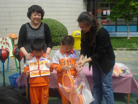 刘老师和吴老师现场讲解演示大班奖品的玩法