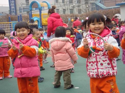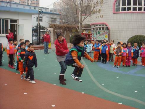 全托班还特别发挥了混龄优势,让大班组的孩子们为弟弟妹妹们展示了跳小绳和跳大绳。老师们也参与到体能活动中来,为孩子们展示了跳皮筋的传统体育游戏,“马兰开花二十一,二八二五六,二八二五七,二八二九三十一……”孩子们齐声为老师喊唱歌谣,将气氛推向了高潮。