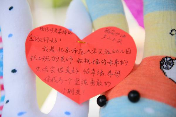 大家一起亲手制作的“抱抱”玩偶和爱心图书,在六一儿童节前夕,这些礼物送到了芦山第二幼儿园,希望在今年这个灾后的第一个儿童节,带给他们关怀和温暖。