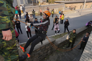 针对火灾逃生,老师们还体验了从高楼上逃生的办法:索降体验;老师们在教官的指导下,学习如何系好安全绳,掌握从高楼速降的方法。