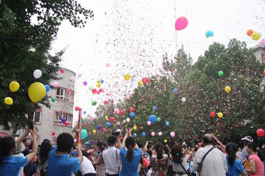 最激动人心的时刻是授礼仪式,园长亲自给每一个孩子颁发毕业证书,授博士帽。孩子们神情庄严,迎接着人生的第一次毕业。最后,集体放飞心愿气球,一个个氢气球带着孩子们美好的愿望飞上了天空。