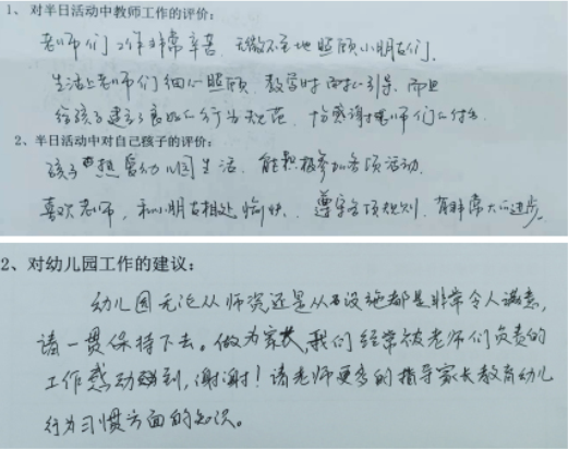 半日开放活动中家长通过观看、参与、体验、交流等多种方式全方位地了解了幼儿在园的学习、生活情况,并借助园方提供的观察记录表,感受了每一个环节的培养目标,对自己的孩子形成了较为理性的全面的评价。家长们看到了孩子们的自由、自主、自然、有序,看到了小班幼儿在短短2个多月中自理能力的惊人成长,看到了中班幼儿创造性的探索和发现,看到了大班幼儿的有礼有节、会合作且充满责任感……也看到了老师们对孩子们细心地呵护、尽心地教导、耐心地解答……看在眼里,感动在心里。