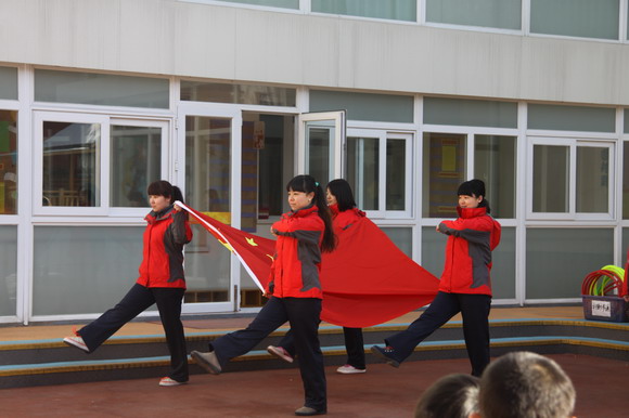 开学第一次升旗,由老师给孩子们做示范