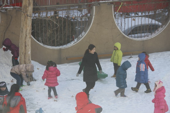 和老师小朋友一起堆雪人、打雪仗,最开心!