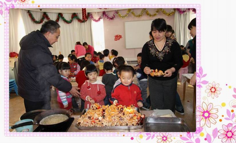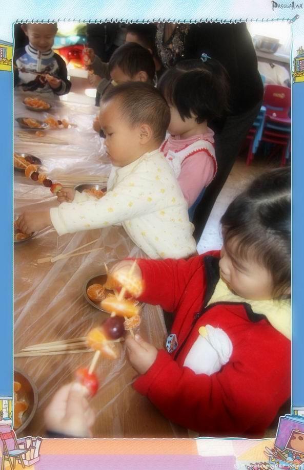 2010年12月24日,婴小班的孩子们在艺人和家长志愿者们的帮助下,亲眼观看并参与制作了冰糖葫芦儿,然后美美地品尝了自己做糖葫芦儿。对于婴小班孩子来说,这是新年里最高兴的事儿了。