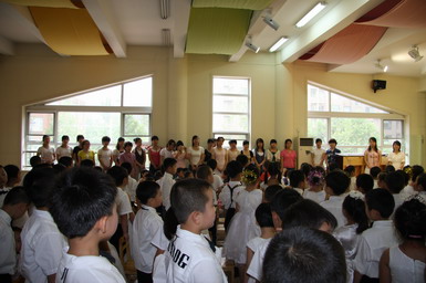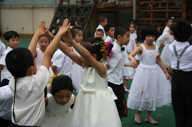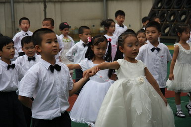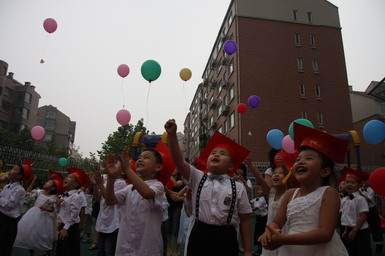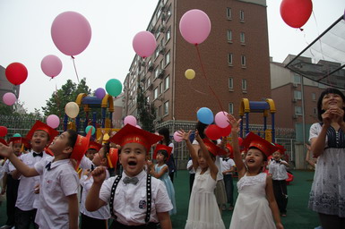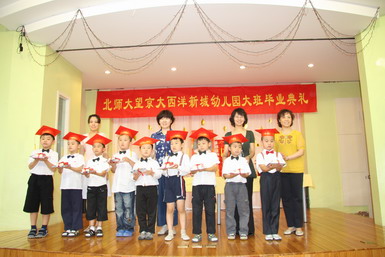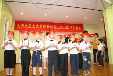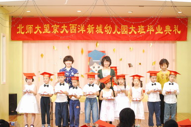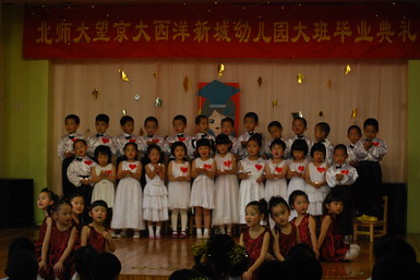 2008年6月27日,北京师范大学望京大西洋新城幼儿园举行了08届大班毕业典礼。孩子们身着节日的盛装、站着整齐的队列,共同演唱起《老师,再见了》和《爱的真谛》,伴随着大班小朋友悠扬动听的毕业之歌,大班毕业典礼拉开了序幕。在毕业典礼上,孩子们不仅用歌声表达了对幼儿园、老师、弟弟妹妹的惜别之情,还用真挚的感情朗诵了毕业献辞、为幼儿园献上了一份精心的毕业礼物。当史园长为小朋友戴上毕业帽、颁发毕业纪念册时,全场响起了热烈的掌声,大家共同为每一名大班小朋友喝彩!最后满载着幼儿心愿、老师期望的心愿气球徐徐升上天空,孩子们跳起了优美的集体舞,共同感受着在幼儿园里这最后的美妙时刻,庆祝自己的成长!