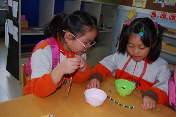 我来挑战穿最小的珠子。 看,我是按规律穿的。