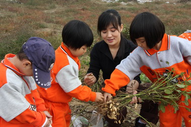 中二班的老师在请小朋友品尝刚刚摘下花生的味道