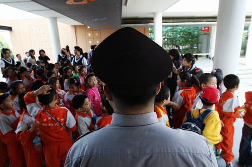 活动前,为了保障幼儿的出行安全,徐园长多次就安全事宜讨论,最后决定组成临时安全护卫队,由我园男教师、保安以及四名“爸爸”担任安全护卫队成员,在徐园长的带领下,全程参加活动。