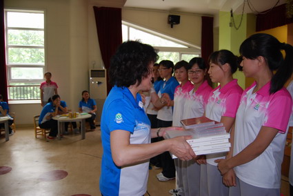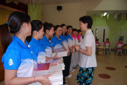 教师节了,黄珊总园长来到望京分园向所有教师送上节日的问候。 “虫儿飞,花儿睡……”合着轻柔的歌声,伴着馥郁芬芳的花香,望京分园教师节暨教师新操汇演开始了。 首先,黄珊总园长对教师们一年来为备战示范园验收所付出的辛劳表示衷心的感谢,献上了最真挚的节日祝福,并给每一位教职员工赠送一份精美的教师节礼物:沉甸甸的正规滚球app官方网站《百年有园》的园史画册和幼儿园95周年大型汇演的光盘,勉励教师努力、奋斗,尽情去享受教师职业的快乐。 黄园长讲话 赠送《百年有园》画册和九十五周年园庆光盘 接下来,黄珊总园长在徐园长、徐主任、王主任等的陪同下,观看了教师们的新操汇演。分成婴小、中大以及混龄班三个班组,教师们矫健有力的步伐、灿烂青春的笑脸以及健康、活力、向上的姿态感染着在场的每一位观众。后勤老师也参与操表演,几位新教师还表演了健美操。