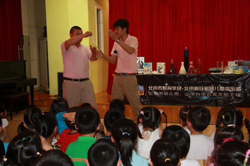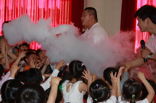 在疯狂科学表演中,“疯狂家族”的大哥哥们奉上了大气压强、二氧化碳等精彩纷呈、令人目不暇接的科学实验表演,孩子们也用高涨的热情积极回应着大哥哥们。整个表演在孩子们的热烈欢呼与掌声中展开,孩子们在惊喜、快乐的同时开拓了眼界,增长了科学知识,更感受到了科学的魅力!