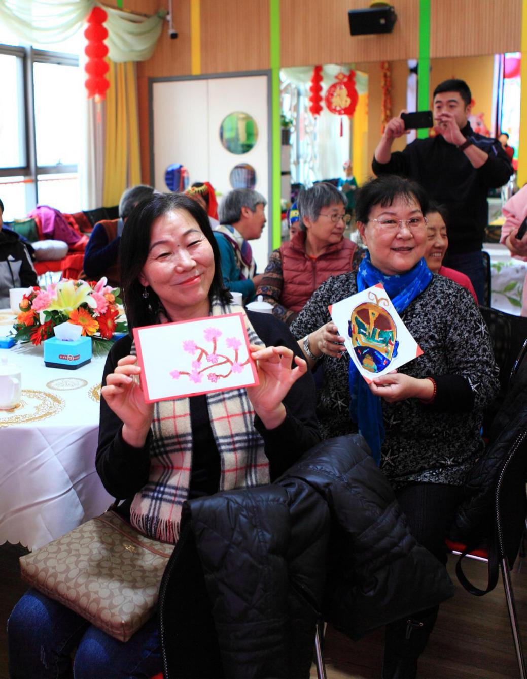 小朋友们将亲手制作的年画、脸谱送给奶奶老师,祝福她们福如东海,寿比南山,年年有余,岁岁平安。