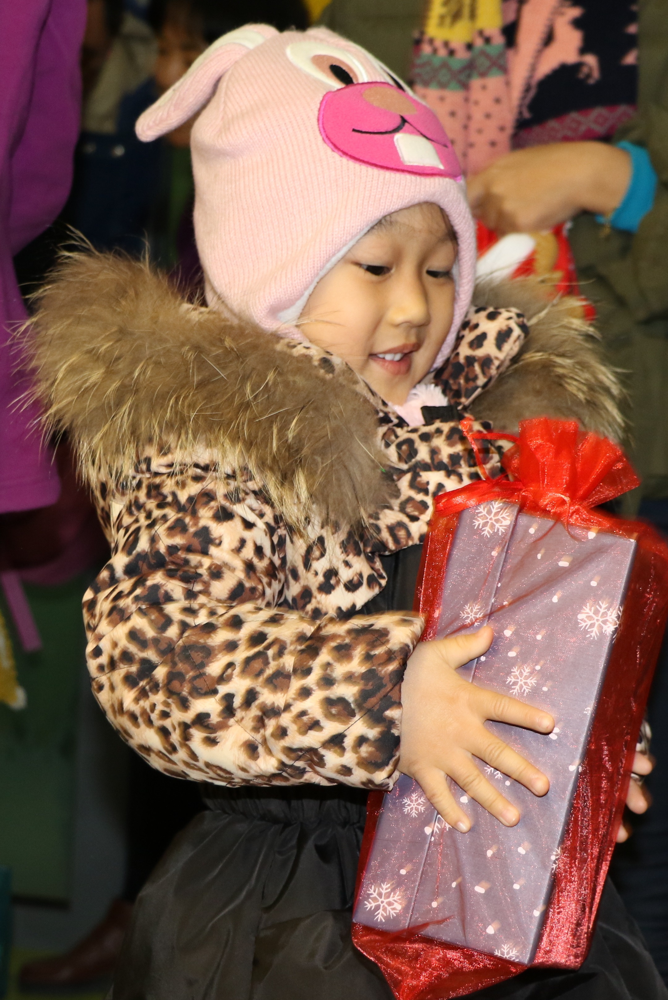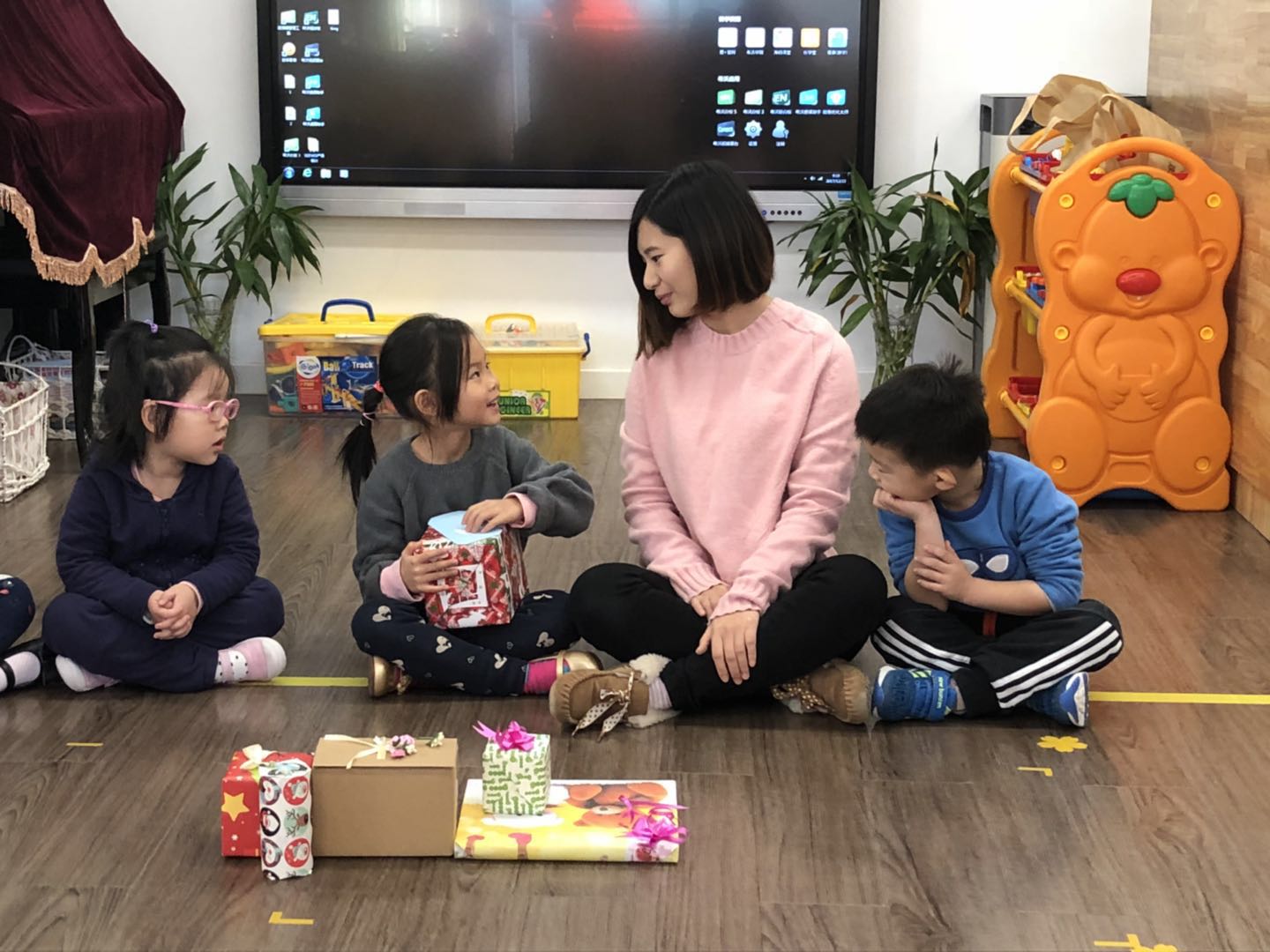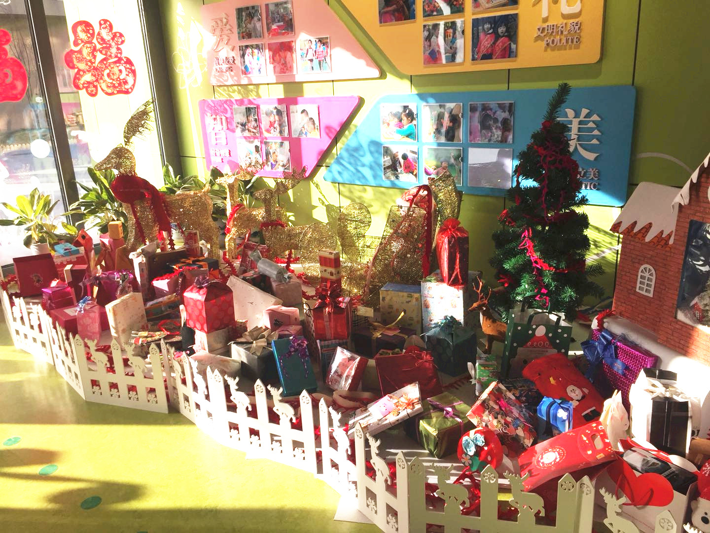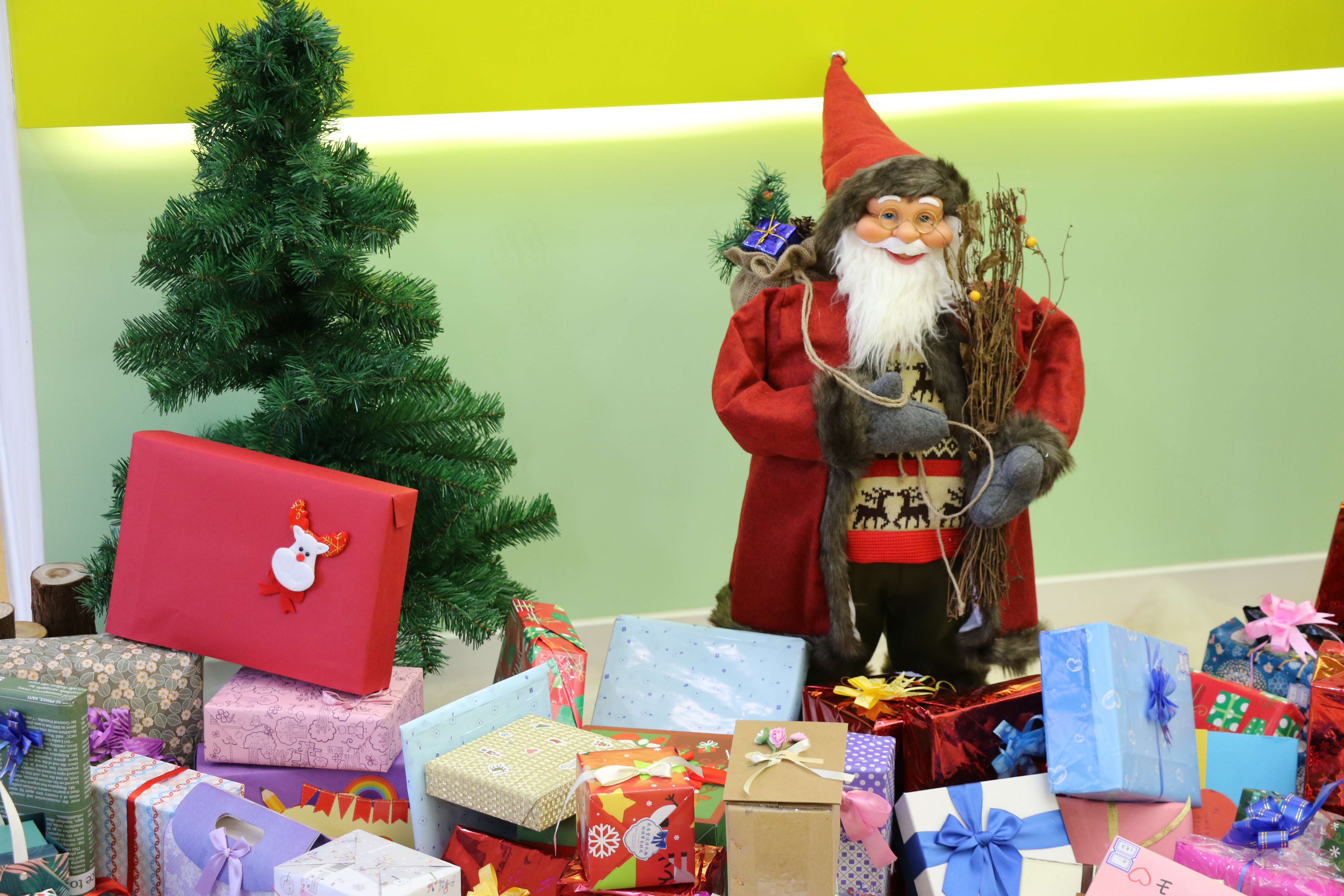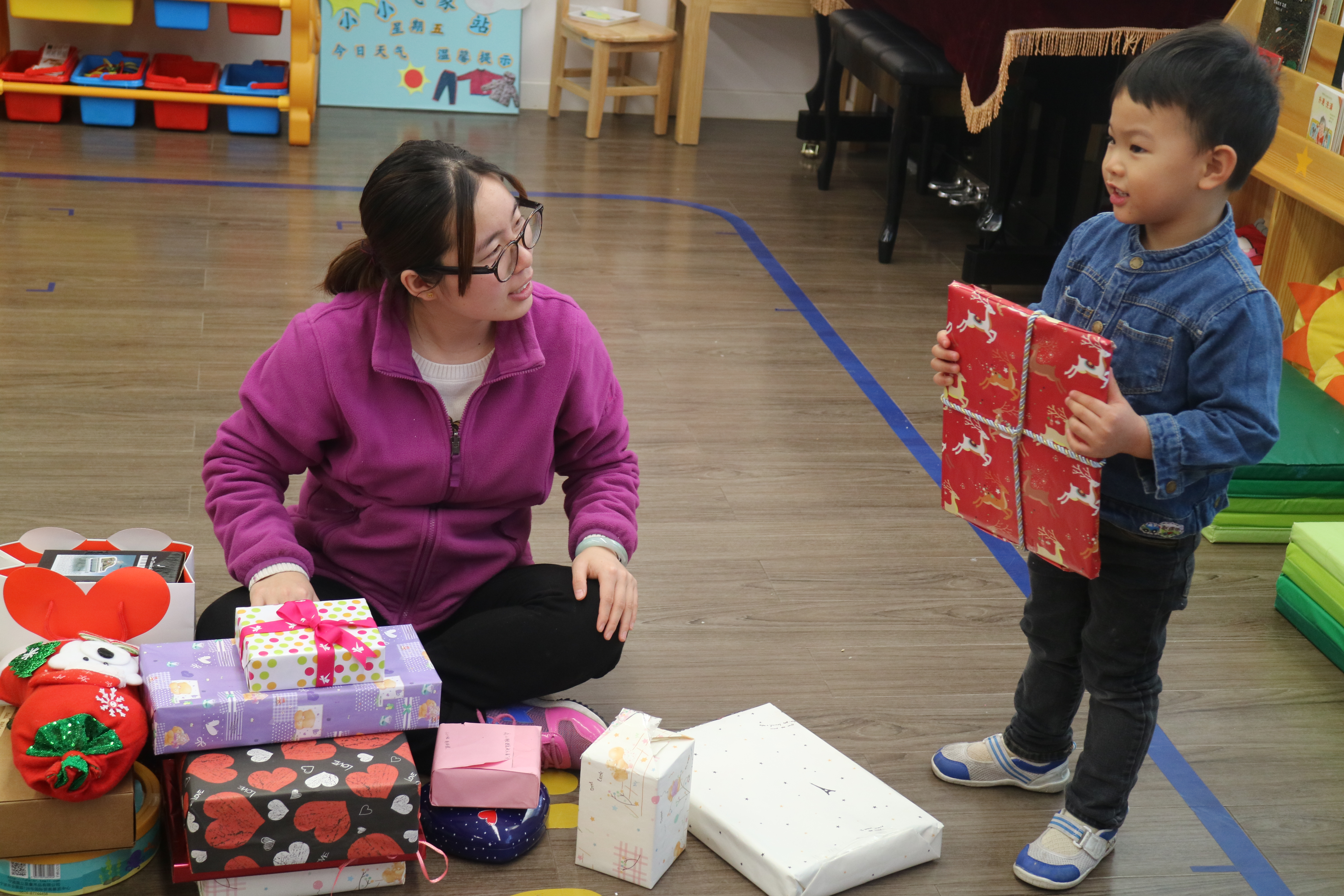 “这个红色包装的礼物是送给新朋友的!祝他圣诞快乐!”