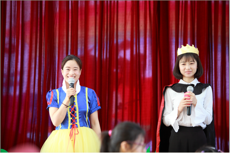 美丽的喇老师扮演的白雪公主和陈老师扮演的王子来当主持人,演出开始!