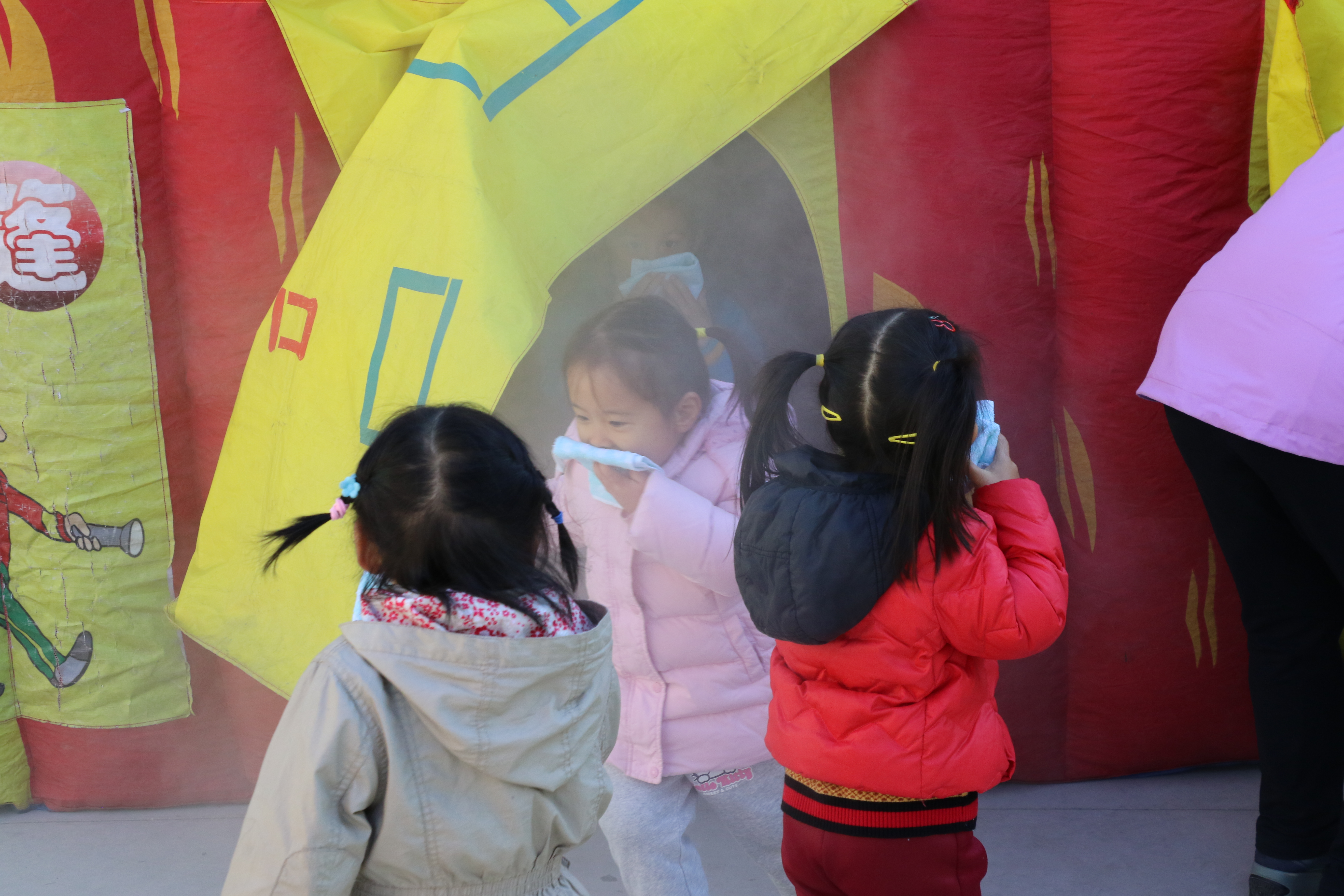滚球app拿着湿毛巾、捂住口鼻,弯腰小步在黑黑的烟雾帐篷里模拟"逃生"演习。